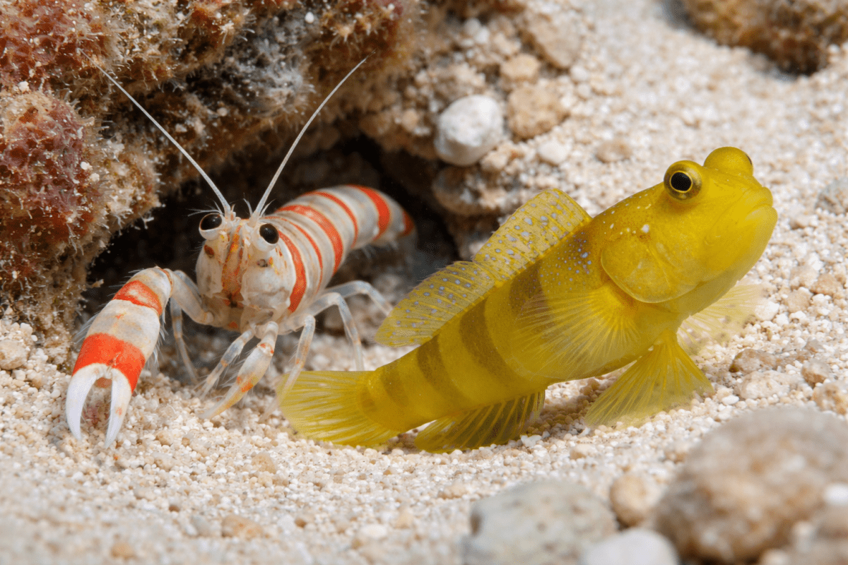 In the wild, pistol shrimp and watchman gobies share a burrow that the shrimp constructs and maintains while the goby stands guard at the entrance. The shrimp, which has very limited vision, maintains constant physical contact with the goby through its antennae. When the goby detects danger and darts into the burrow, that movement signals the shrimp to follow immediately. In return the shrimp provides the goby with a safe, well-maintained shelter it could not construct on its own. This arrangement is so finely tuned that the two animals can spend years together in the same burrow, functioning as a coordinated unit with a level of interspecies cooperation that is genuinely remarkable to observe.