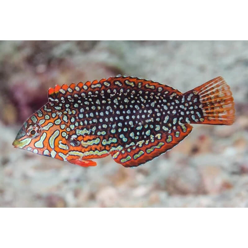 The Ornate Leopard Wrasse is an exquisitely patterned species displaying intricate vermiculated markings. This sand-dwelling specialist requires advanced care but is among the most beautiful of the leopard wrasses.